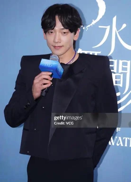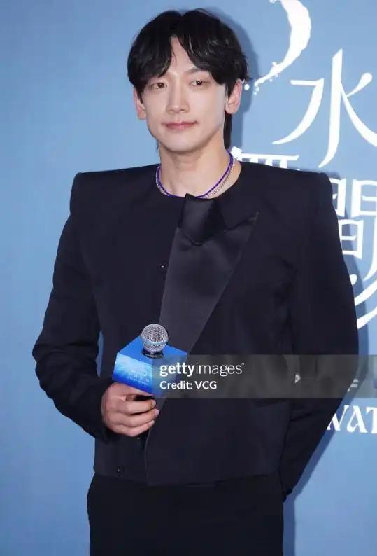 身着双开门样式的西装,造型存在着一种难以言明的别扭之感,或许是为了呼应主题,Rain配搭了一条深紫色的项链,然而如此看来整体的配色有些刺眼。