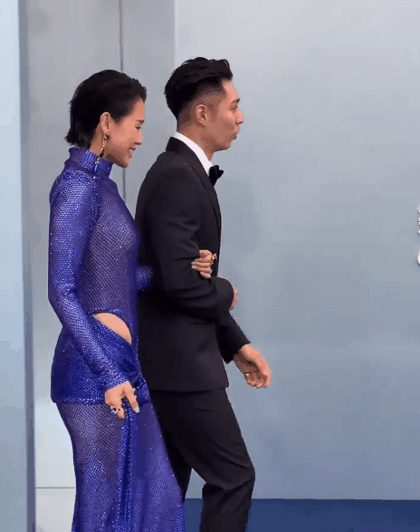 一件宝石蓝亮钻礼服,有着透视之感,两侧腰胯部位镂空,这愈发凸显她具有细瘦且性感的身材,走动之际,一双为大家所见的长腿极为引人注目。