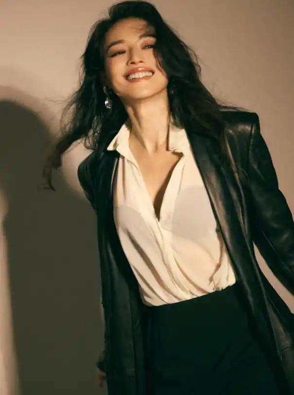 舒淇的第三套造型,是黑色皮衣,搭配着白衬衫,其深V的衣领,巧妙展现出那性感味道,一丝都不外露,却格外迷人,再搭配上舒淇肆意张扬的笑容,氛围感被拉满,美的太突出 。