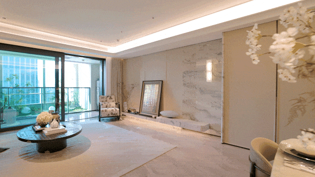 ,顶部配置线性凉霸+LED嵌入式回形灯带+筒灯,灶台后侧采用大面积岩板铺设,方便清洁的同时显得厨房更加大气。厨电配置了德国厨房顶奢品牌博世(或同等档次)四件套抽烟机+燃气灶+洗碗机,带末端净水器,弗兰卡(或同等档次)大单槽+可抽拉龙头,冰箱也是交付的!柜门白色烤漆面板,抽屉分区也都是帮大家细致划分,如多功能调味拉篮+谷物抽+碗碟拉篮等。岛台上配置可升降插座,铝合金抽屉,石材背景板的金属开放格实用性很强。电视背景墙采用卡慕白的石材+皮革造型,弧形吊顶,相当讲究,连空调出风口的形状都打造为海上·清和玺logo山茶花的形状~~三大件为大金(或同等档次)中央空调和地暖,新风系统为百朗(或同等档次),南向阔景阳台,采光视野一级棒!