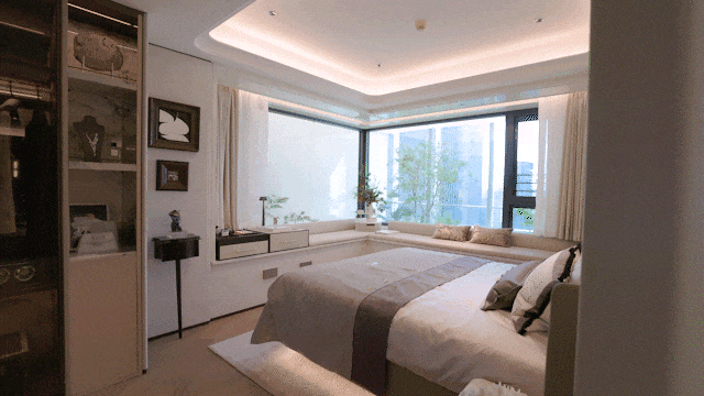 ,户型设计在上一个户型的基础上将各功能间尺度升级的同时,也做了一些更人性化的迭新。主卧约270°L形飘窗设计,将窗外的美景尽收眼底,注重美观的同时,也兼顾了实用性与舒适性,让业主在繁忙的生活中也能享受到宁静与安逸。